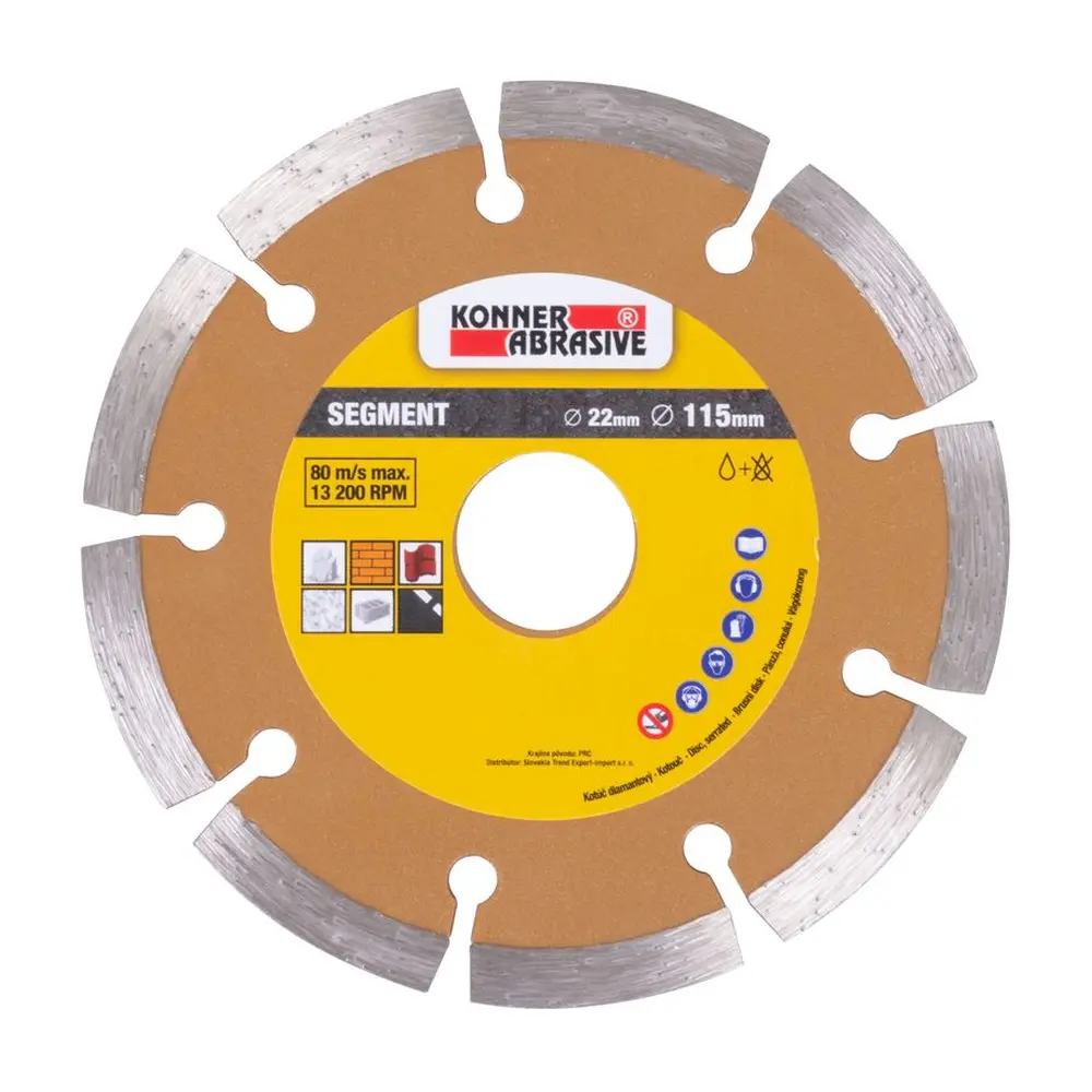Diamantový kotúč KONNER je vhodný pre domácich kutilov, ale aj pre profesionálnych remeselníkov. Vhodný je pre mokré aj suché rezanie. Má široké použitie – tehly, murivo, kameň, dlažba, strešná krytina, betón, žula a mramor. Jeho priemer je 115 mm a maximálne povolené otáčky sú 13 200 rpm.